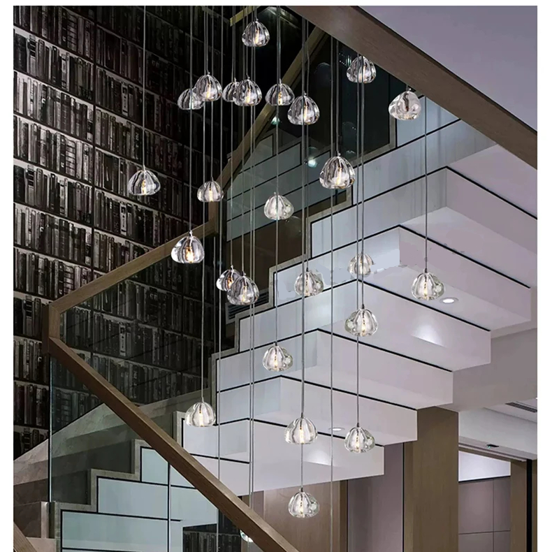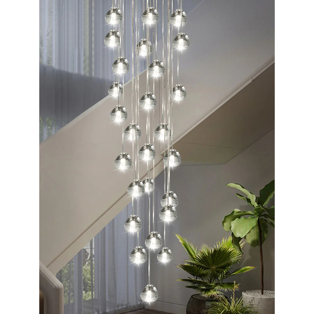 Ce plafonnier en cascade de boules en cristal habille votre escalier avec une finesse aérienne. Chaque sphère suspendue capte la lumière avec délicatesse. L’ensemble forme une colonne lumineuse d’une rare élégance.