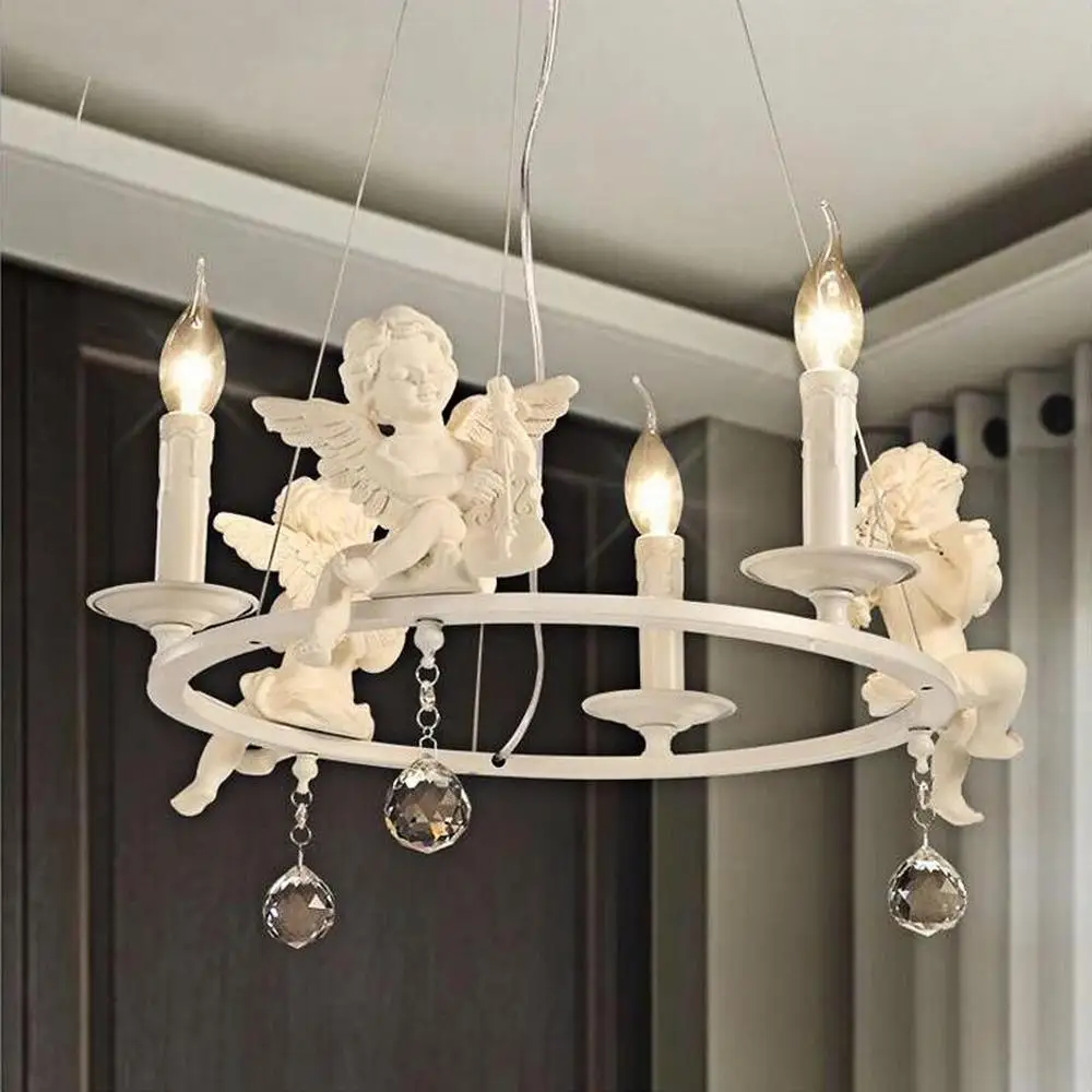 Ce plafonnier chandelier avec ses figurines d’anges sculptés transporte votre intérieur dans un univers raffiné et empreint de douceur. Posés sur leur cercle lumineux, ces petits chérubins apportent une aura protectrice à la pièce. La lumière, douce et chaleureuse, renforce cette atmosphère apaisante, idéale pour une chambre, une salle de lecture ou même un salon romantique.