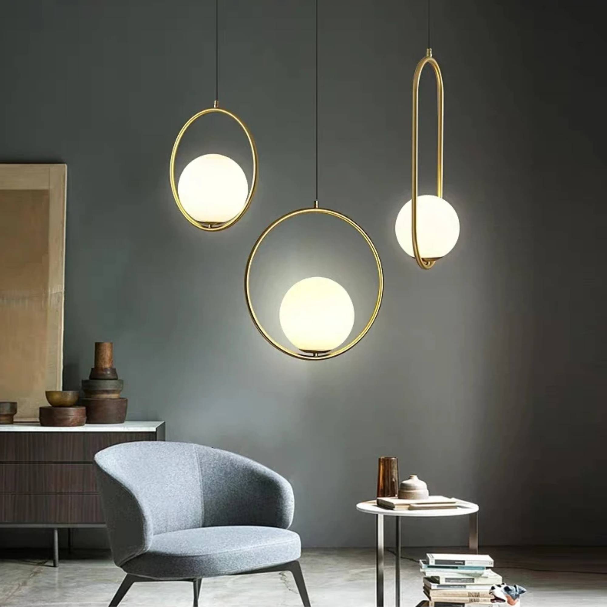 Ce plafonnier boule suspendue allie minimalisme et chaleur. Son globe en verre diffuse une lumière douce tandis que l’anneau doré ajoute une touche chic. Parfait pour créer une ambiance moderne et apaisante, même dans les petits espaces comme une entrée ou une chambre cosy.