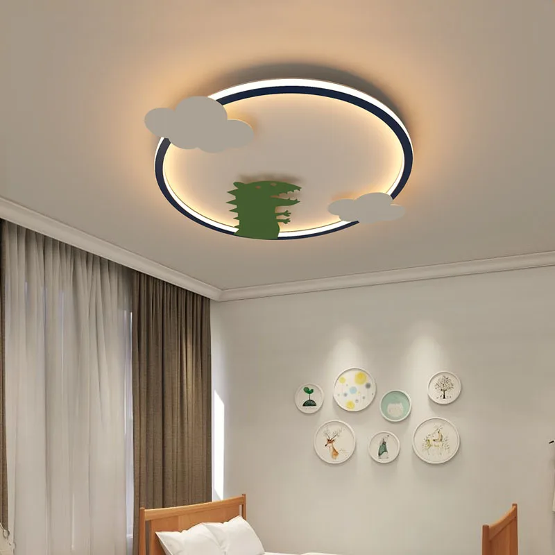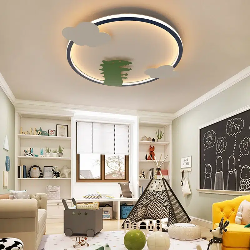 Un plafonnier à l’allure vive pour les amateurs de dinosaures, combinant style et lumière dans une chambre qui ne manque pas de personnalité.