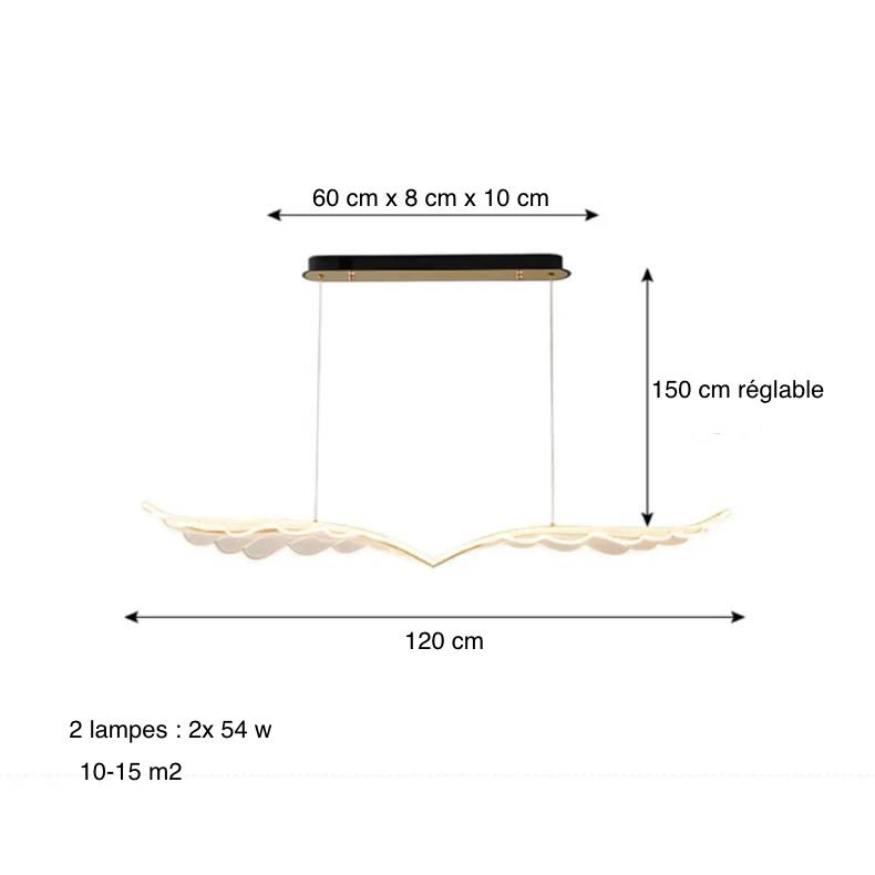 - Dimensions: Plafonnier : Longueur : 60 cm, Largeur : 8 cm, Epaisseur : 10 cm Câbles de suspension : 150 cm réglable Lustre : Longueur : 120 cm