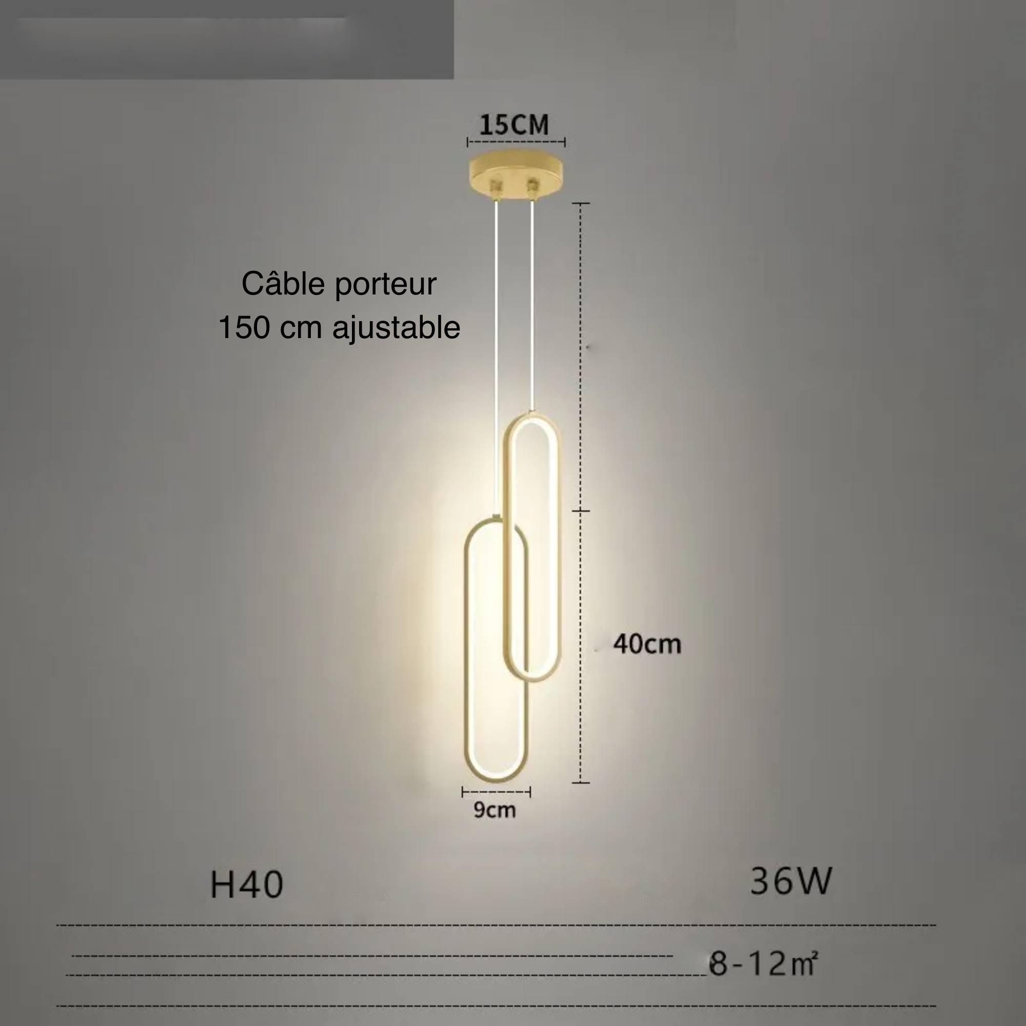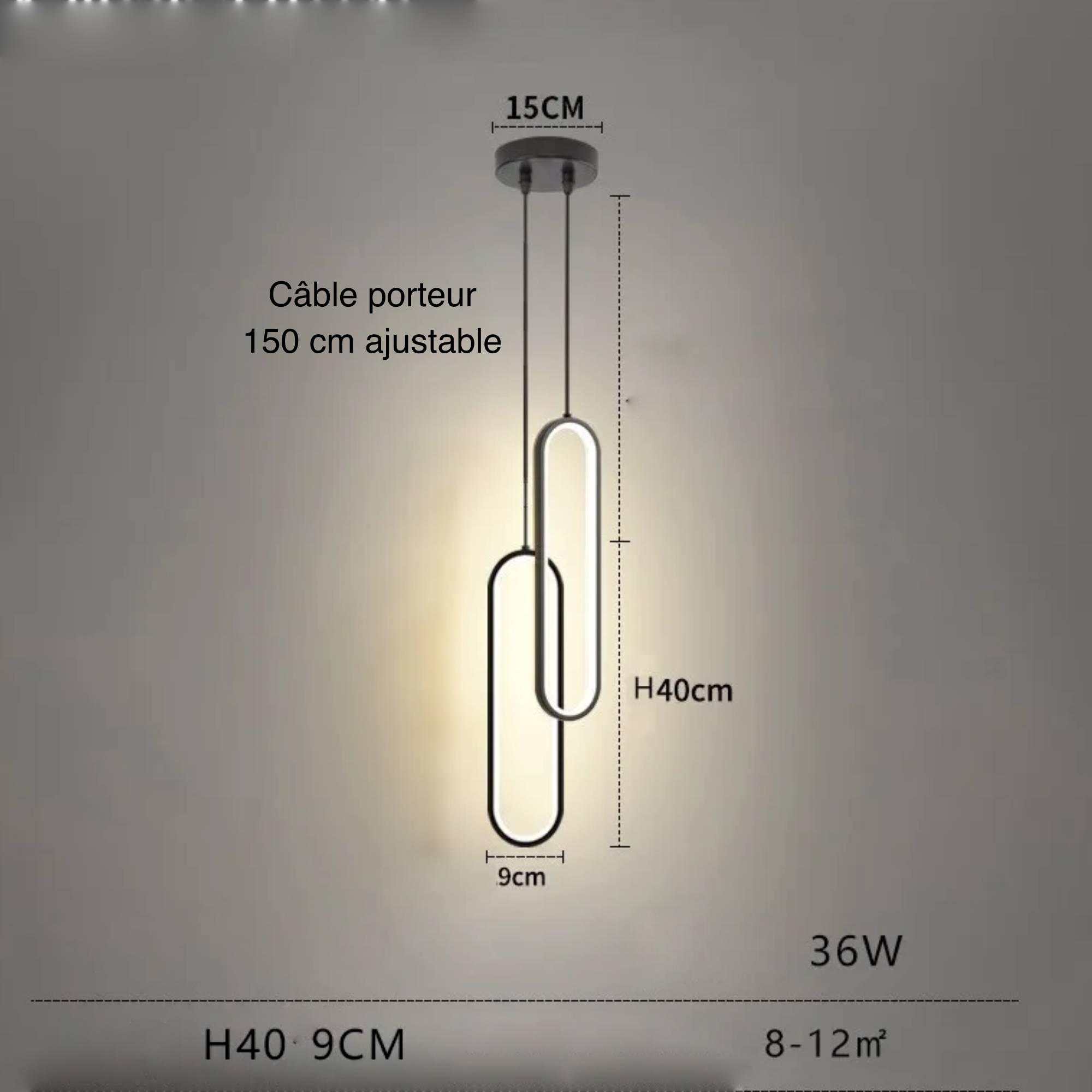 - Dimensions: Modèle 1 : Câble porteur : 2m ajustable Modèle 2 : Câble porteur : 150 cm ajustable Lampe : Largeur : 9 cm, Hauteur : 40 cm